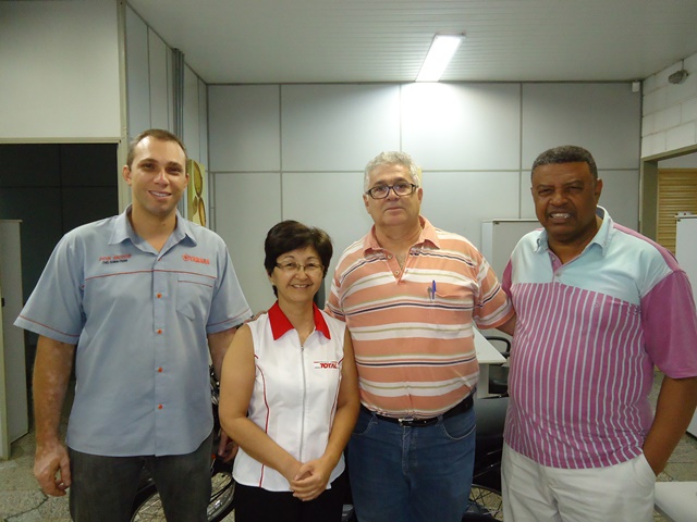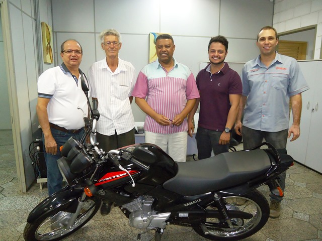 O presidente da ACE-Matão, Sergio Floriano, o proprietário da Piva Motos Yamaha e 2º tesoureiro da ACE-Matão, Leonardo Piva, e representantes da Drogaria Total e da Relótica participaram da solenidade de entrega.